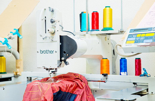 完成したデザインを基に刺繍のデータを作成し、商品に加工していきますが、 生地や商品の種類に応じて針や糸を変更して実際の仕上がりが綺麗になるよう 調整します。時には、何度も試し打ちを行いながら最善の仕上がりを目指しています。 製作担当:刺繍(團)