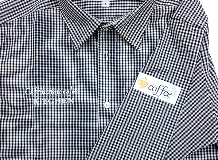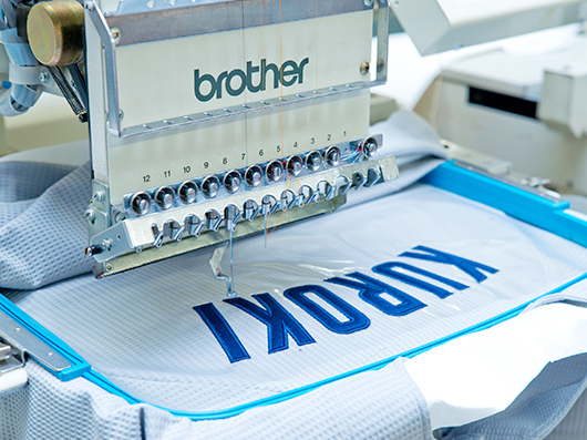 作成~取り付けの複合加工胸はプリント加工、袖には刺繍加工と1つのアイテムに複数の加工方法を組み合わせた加工が可能。