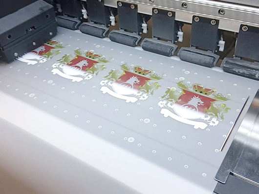仕上がりは、非常に繊細で色の調整なども他の加工に比べると柔軟に行う事ができます。加工できる素材は、ポリエステル100%の白生地のみとなりますが、弊社ではこの技法を用いてオリジナルワッペンの作成や原反生地への印刷など幅広く加工を行っております。