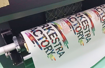 輪転式のプレス機を用いた大柄のプリントにも対応。原反の生地ごと染めたい場合や、幕の作成なども可能です。