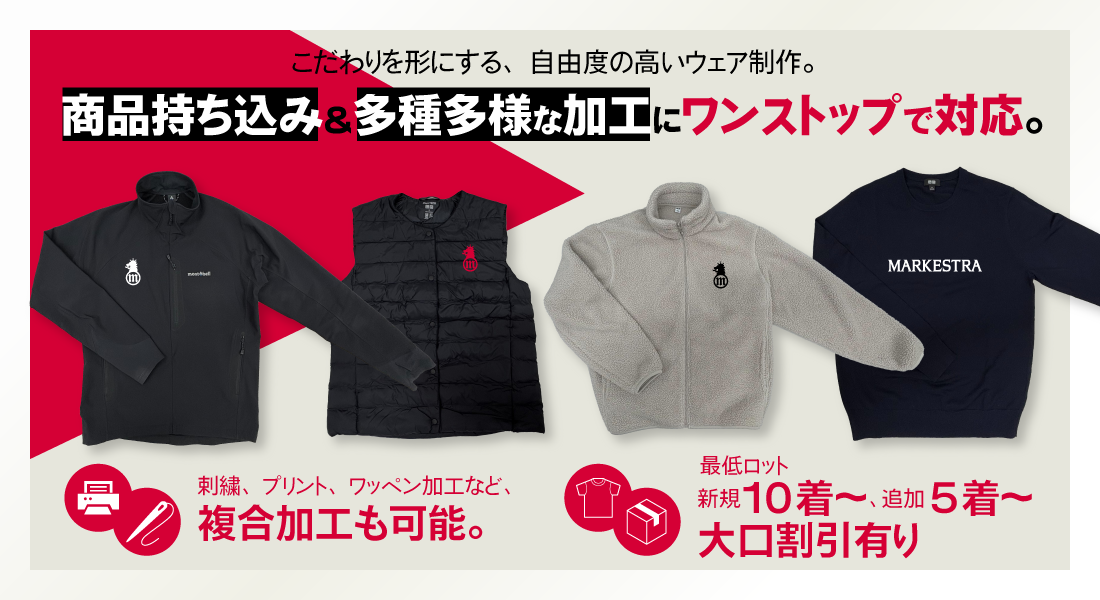 - 左胸には刺繍、背中にはプリントというように1つのアイテムへ複数の加工をしたい